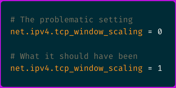 This is more or less specific to our setup, but the root cause traced back to a well-intentioned security hardening script that had disabled TCP window scaling across our infrastructure.
