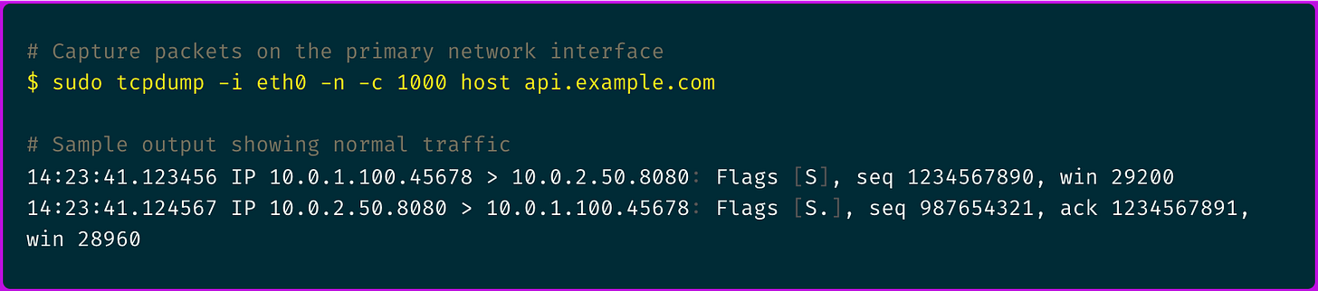 The three-way handshake looked normal, but I needed deeper visibility into what was happening after the connection was established.