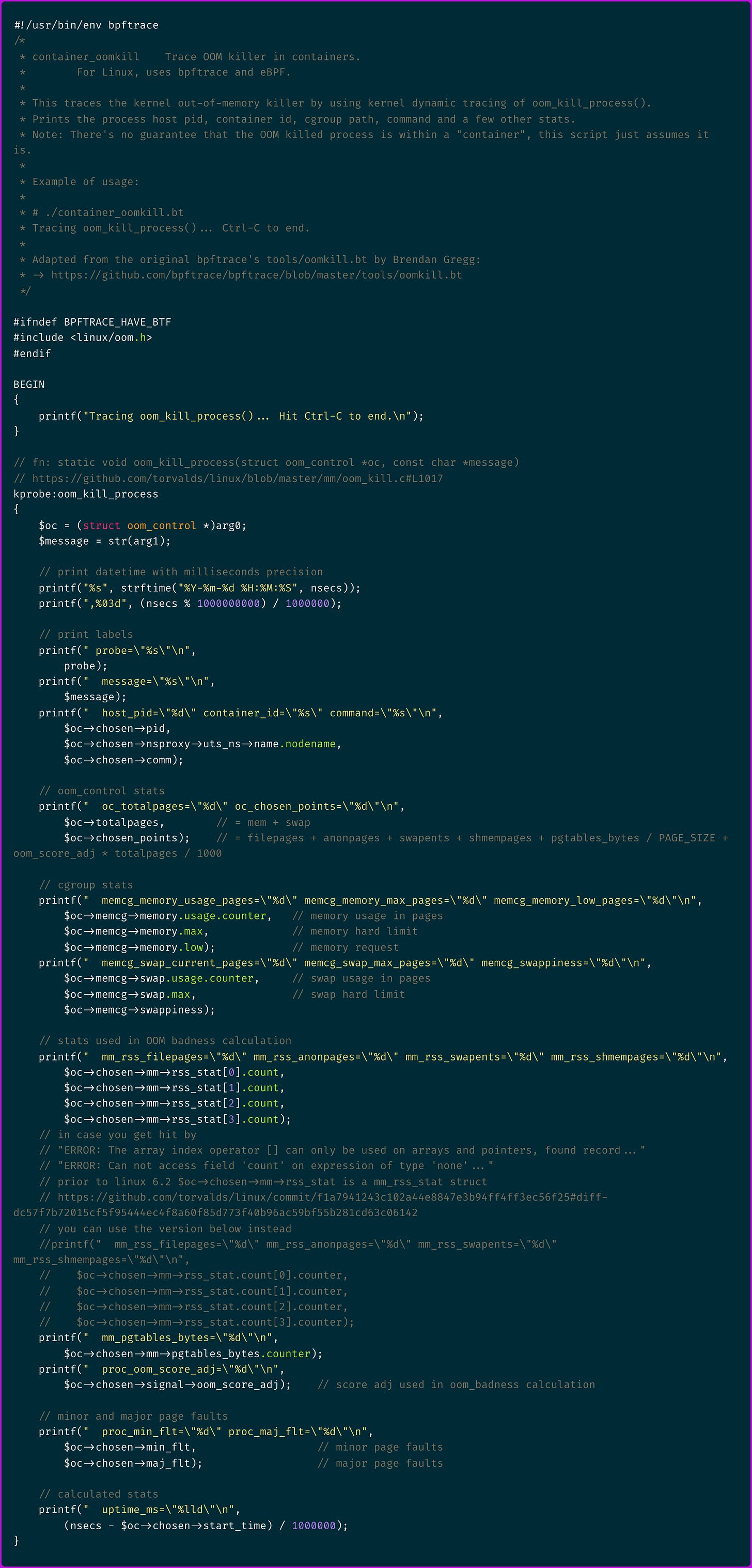 As the above are the main variables which influence the OOM killer's process selection let's see if we can include them in the output of the bpftrace probe.