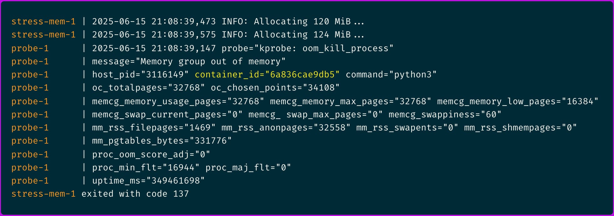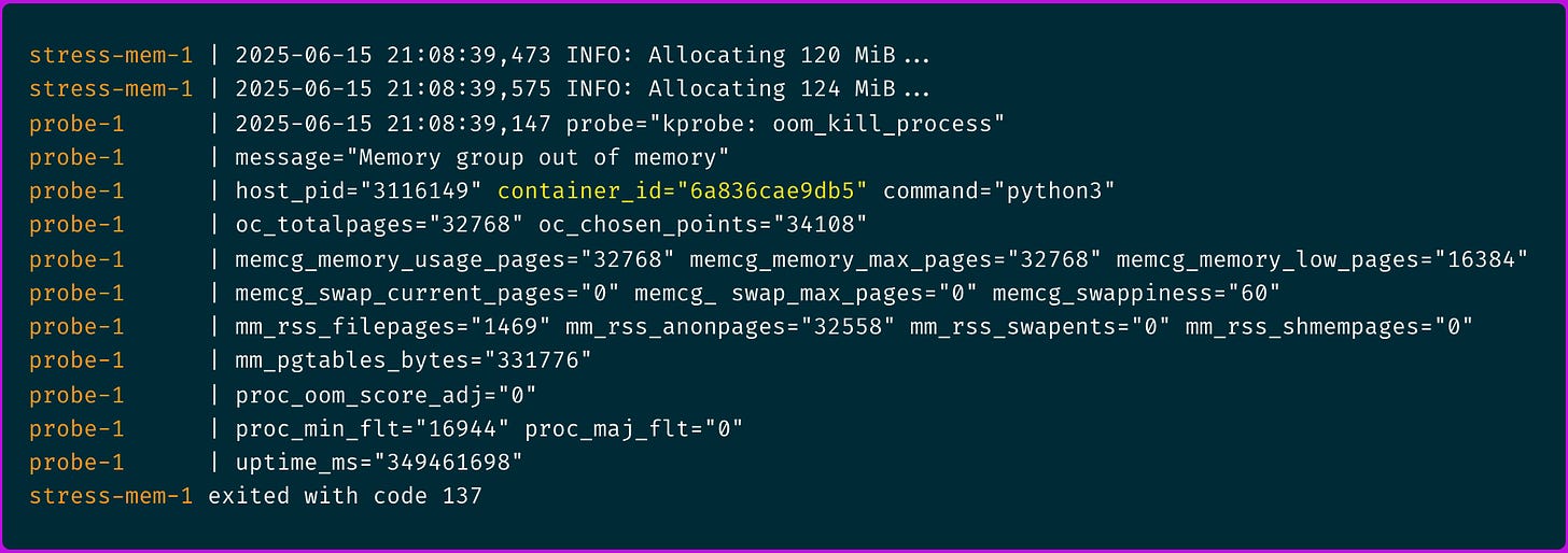 No major page faults, no swap, the process got OOM killed at 124MiB which is the last increment before it could reach 128MiB. Perfect. Our probe works yay!