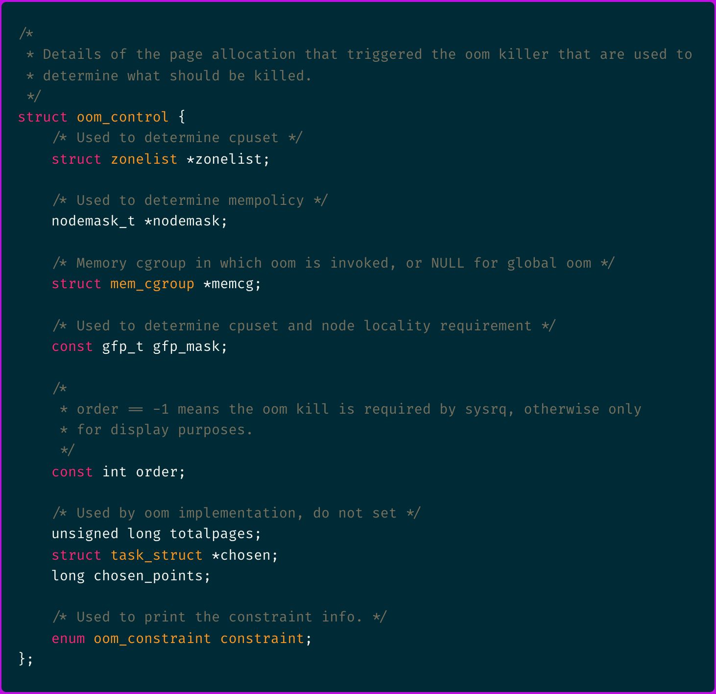 is a mem_cgroup object that holds the container's cgroup memory usage and limits.chosen